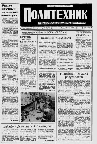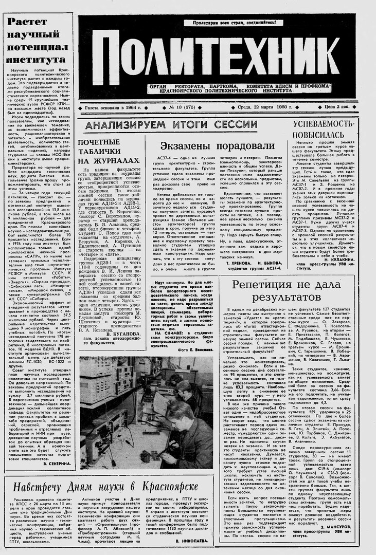 Политехник : газета/ Краснояр. политех. ин-т. - Красноярск : КГТУ, 1964 - - 2006 1980г. N 10 (575) (12 марта) http://lib3.sfu-kras.ru/ft/LIB2/ELIB_DC/SFUPRSV/sfupol/1980/1980_03_12_0575.pdf