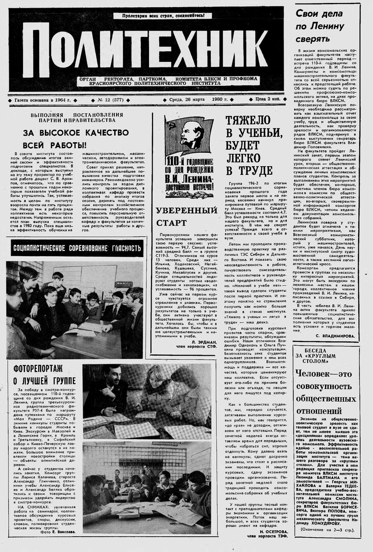 Политехник : газета/ Краснояр. политех. ин-т. - Красноярск : КГТУ, 1964 - - 2006 1980г. N 12 (577) (26 марта) http://lib3.sfu-kras.ru/ft/LIB2/ELIB_DC/SFUPRSV/sfupol/1980/1980_03_26_0577.pdf
