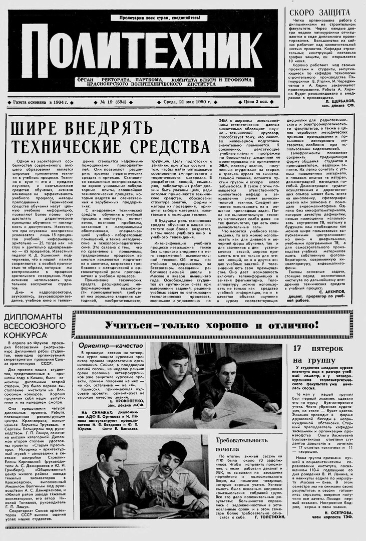 Политехник : газета/ Краснояр. политех. ин-т. - Красноярск : КГТУ, 1964 - - 2006 1980г. N 19 (584) (21 мая) http://lib3.sfu-kras.ru/ft/LIB2/ELIB_DC/SFUPRSV/sfupol/1980/1980_05_21_0584.pdf