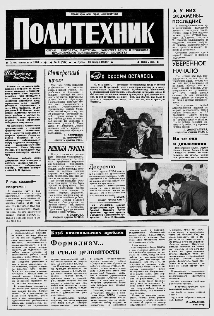 Политехник : газета/ Краснояр. политех. ин-т. - Красноярск : КГТУ, 1964 - - 2006 1980г. N 2 (567) (16 января) http://lib3.sfu-kras.ru/ft/LIB2/ELIB_DC/SFUPRSV/sfupol/1980/1980_01_16_0567.pdf