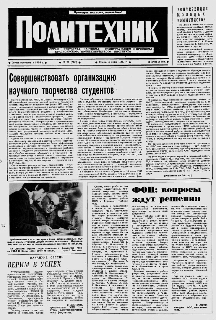 Политехник : газета/ Краснояр. политех. ин-т. - Красноярск : КГТУ, 1964 - - 2006 1980г. N 21 (586) (4 июня) http://lib3.sfu-kras.ru/ft/LIB2/ELIB_DC/SFUPRSV/sfupol/1980/1980_06_04_0586.pdf