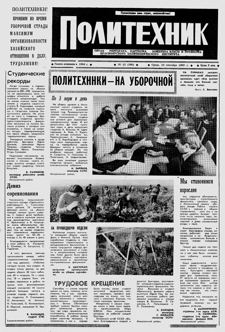 Политехник : газета/ Краснояр. политех. ин-т. - Красноярск : КГТУ, 1964 - - 2006 1980г. N 25 (590) (24 сентября) http://lib3.sfu-kras.ru/ft/LIB2/ELIB_DC/SFUPRSV/sfupol/1980/1980_09_24_0590.pdf