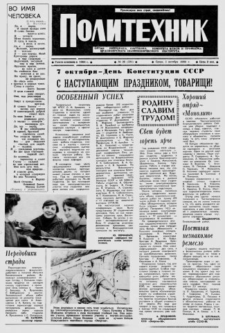 Политехник : газета/ Краснояр. политех. ин-т. - Красноярск : КГТУ, 1964 - - 2006 1980г. N 26 (591) (1 октября) http://lib3.sfu-kras.ru/ft/LIB2/ELIB_DC/SFUPRSV/sfupol/1980/1980_10_01_0591.pdf
