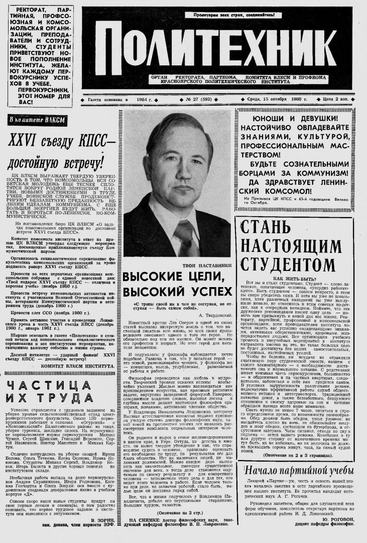 Политехник : газета/ Краснояр. политех. ин-т. - Красноярск : КГТУ, 1964 - - 2006 1980г. N 27 (592) (15 октября) http://lib3.sfu-kras.ru/ft/LIB2/ELIB_DC/SFUPRSV/sfupol/1980/1980_10_15_0592.pdf