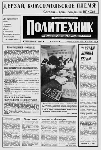 Политехник : газета/ Краснояр. политех. ин-т. - Красноярск : КГТУ, 1964 - - 2006 1980г. N 29 (594) (29 октября) http://lib3.sfu-kras.ru/ft/LIB2/ELIB_DC/SFUPRSV/sfupol/1980/1980_10_29_0594.pdf