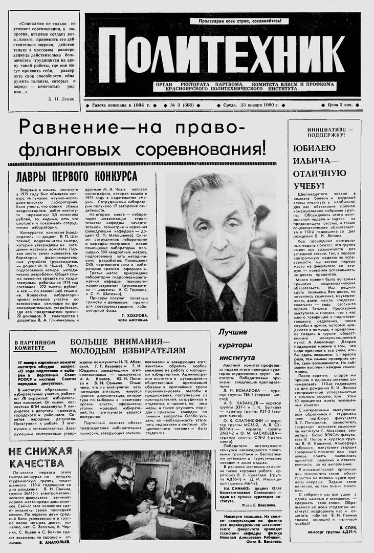 Политехник : газета/ Краснояр. политех. ин-т. - Красноярск : КГТУ, 1964 - - 2006 1980г. N 3 (568) (23 января) http://lib3.sfu-kras.ru/ft/LIB2/ELIB_DC/SFUPRSV/sfupol/1980/1980_01_23_0568.pdf