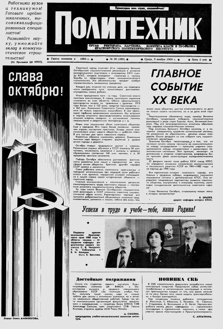 Политехник : газета/ Краснояр. политех. ин-т. - Красноярск : КГТУ, 1964 - - 2006 1980г. N 30 (595) (5 ноября) http://lib3.sfu-kras.ru/ft/LIB2/ELIB_DC/SFUPRSV/sfupol/1980/1980_11_05_0595.pdf