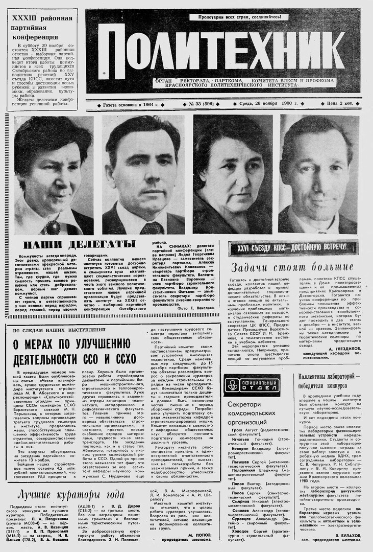 Политехник : газета/ Краснояр. политех. ин-т. - Красноярск : КГТУ, 1964 - - 2006 1980г. N 33 (598) (26 ноября) http://lib3.sfu-kras.ru/ft/LIB2/ELIB_DC/SFUPRSV/sfupol/1980/1980_11_26_0598.pdf