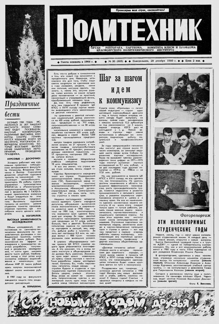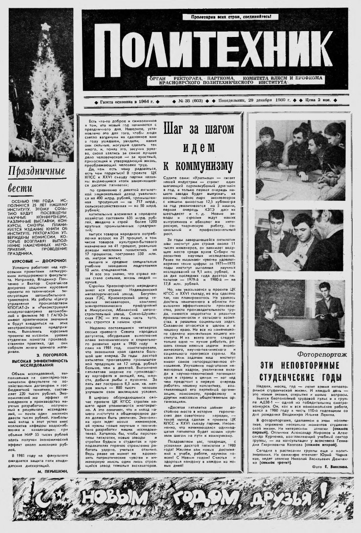 Политехник : газета/ Краснояр. политех. ин-т. - Красноярск : КГТУ, 1964 - - 2006 1980г. N 38 (603) (29 декабря) http://lib3.sfu-kras.ru/ft/LIB2/ELIB_DC/SFUPRSV/sfupol/1980/1980_12_29_0603.pdf