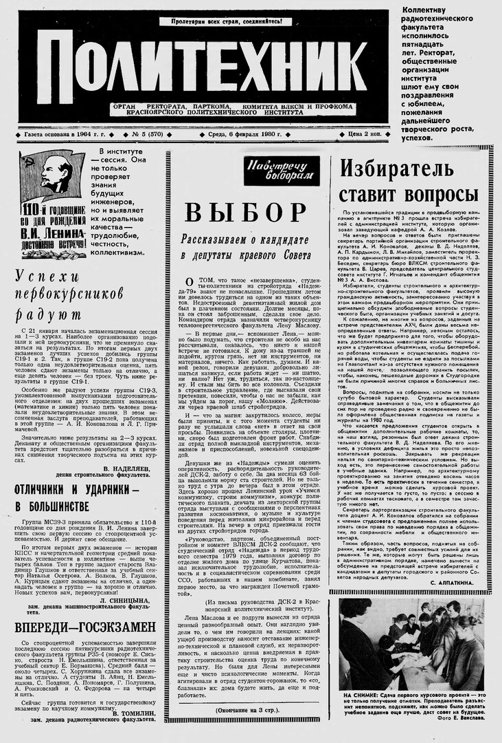 Политехник : газета. 1980 г. № 5 (570) (6 февраля)