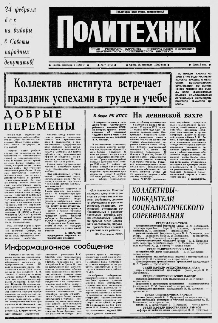 Политехник : газета/ Краснояр. политех. ин-т. - Красноярск : КГТУ, 1964 - - 2006 1980г. N 7 (572) (20 февраля) http://lib3.sfu-kras.ru/ft/LIB2/ELIB_DC/SFUPRSV/sfupol/1980/1980_02_20_0572.pdf