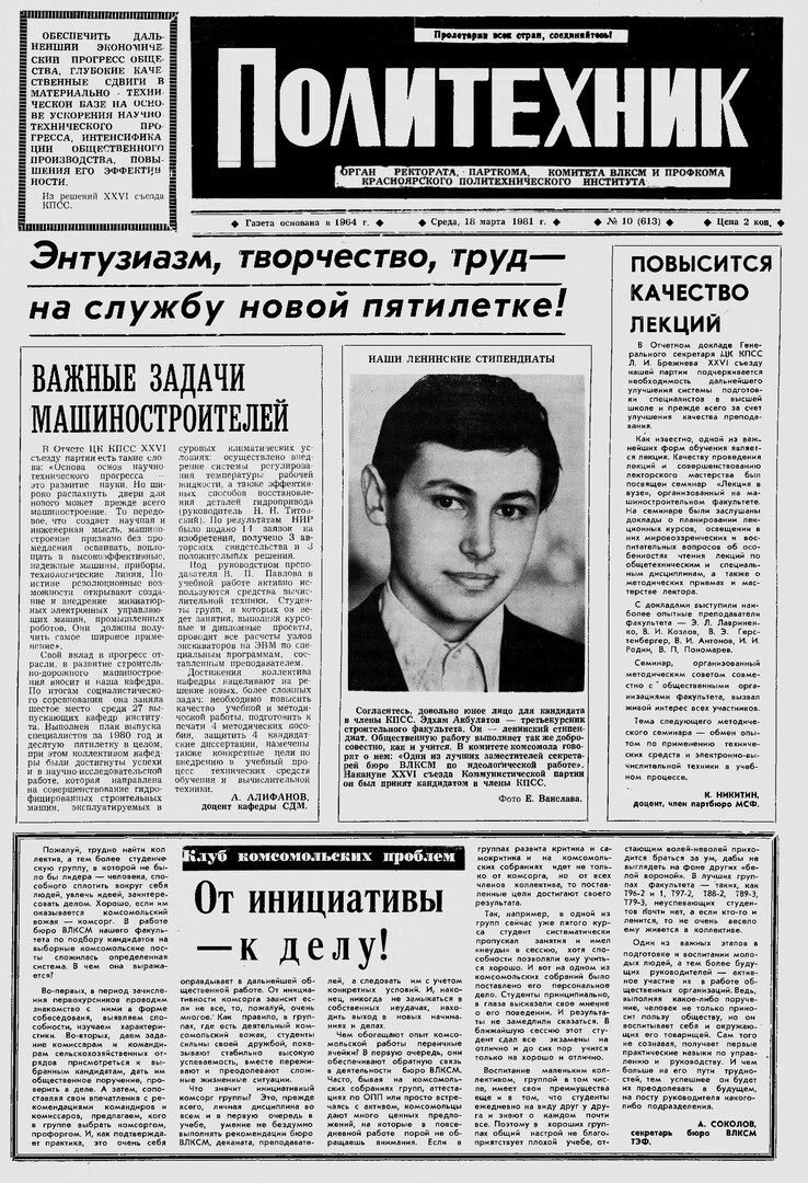 Политехник : газета/ Краснояр. политех. ин-т. - Красноярск : КГТУ, 1964 - - 2006 1981г. N 10 (613) (18 марта) http://lib3.sfu-kras.ru/ft/LIB2/ELIB_DC/SFUPRSV/sfupol/1981/1981_03_18_0613.pdf