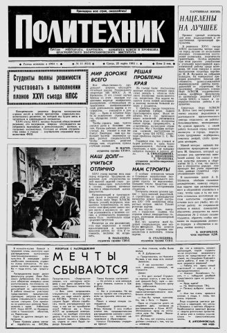 Политехник : газета/ Краснояр. политех. ин-т. - Красноярск : КГТУ, 1964 - - 2006 1981г. N 11 (614) (25 марта) http://lib3.sfu-kras.ru/ft/LIB2/ELIB_DC/SFUPRSV/sfupol/1981/1981_03_25_0614.pdf