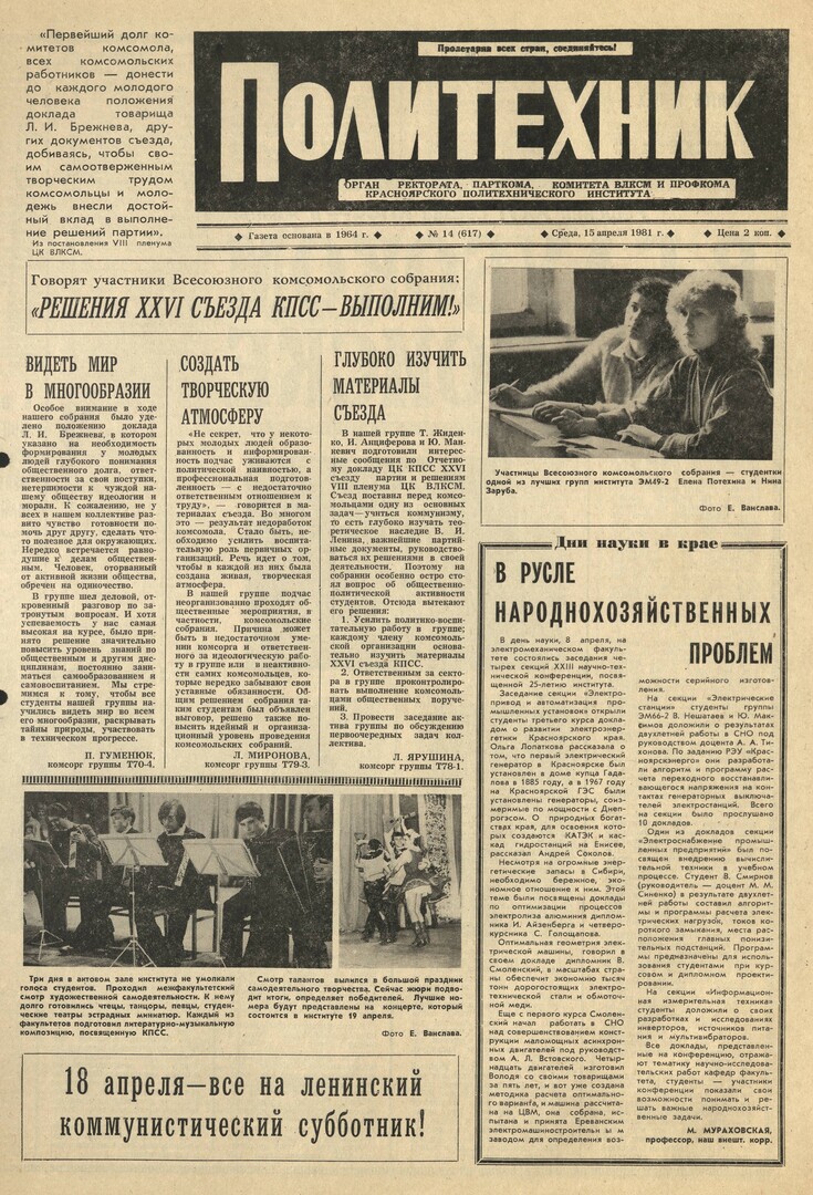 Политехник : газета. 1981 г. № 14 (617) (15 апреля)