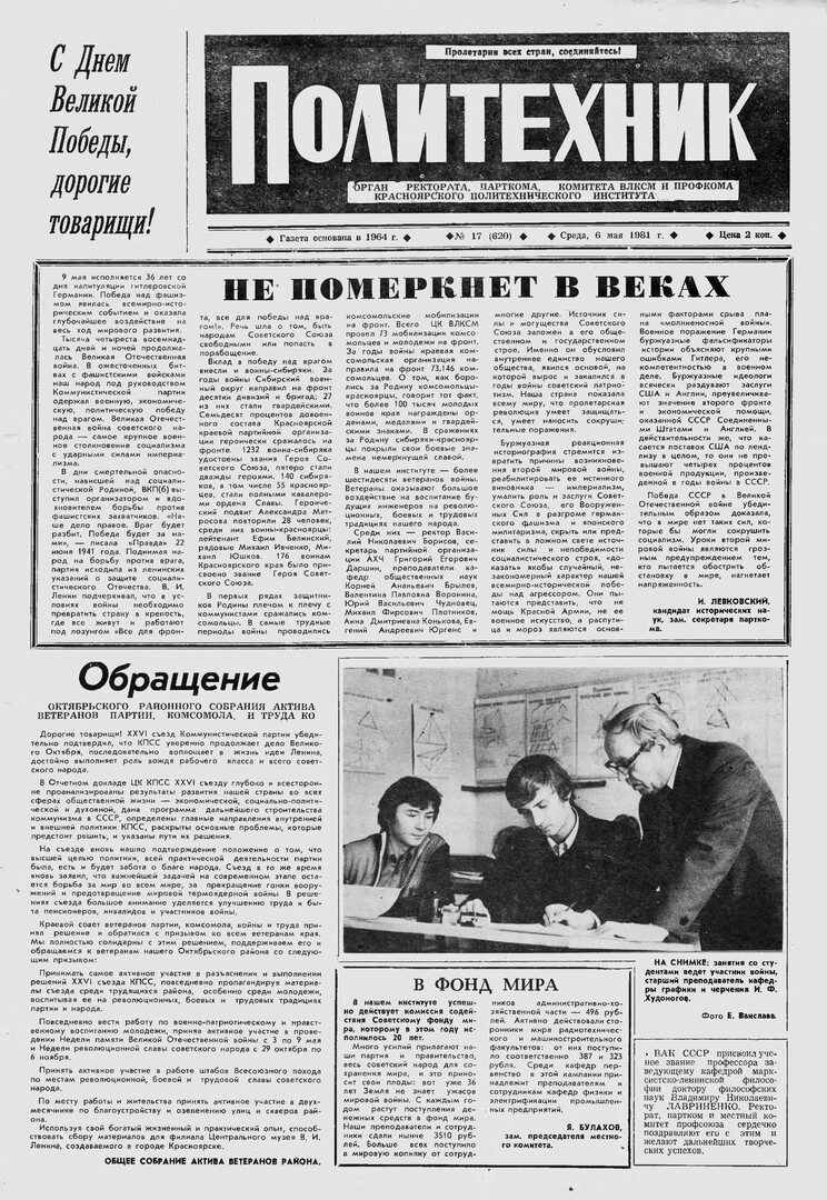 Политехник : газета/ Краснояр. политех. ин-т. - Красноярск : КГТУ, 1964 - - 2006 1981г. N 17 (620) (6 мая) http://lib3.sfu-kras.ru/ft/LIB2/ELIB_DC/SFUPRSV/sfupol/1981/1981_05_06_0620.pdf