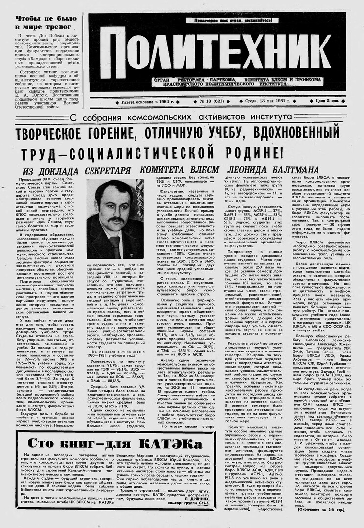 Политехник : газета. 1981 г. № 18 (621) (13 мая)