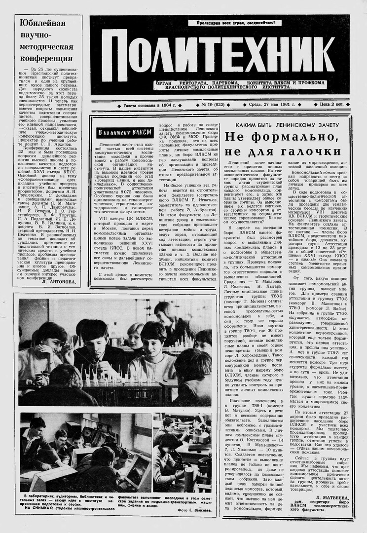 Политехник : газета/ Краснояр. политех. ин-т. - Красноярск : КГТУ, 1964 - - 2006 1981г. N 19 (622) (27 мая) http://lib3.sfu-kras.ru/ft/LIB2/ELIB_DC/SFUPRSV/sfupol/1981/1981_05_27_0622.pdf