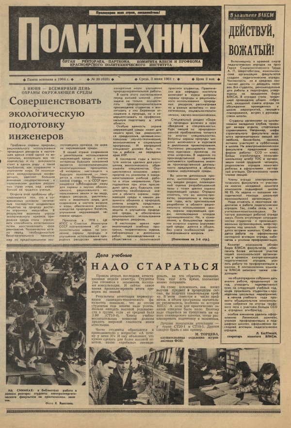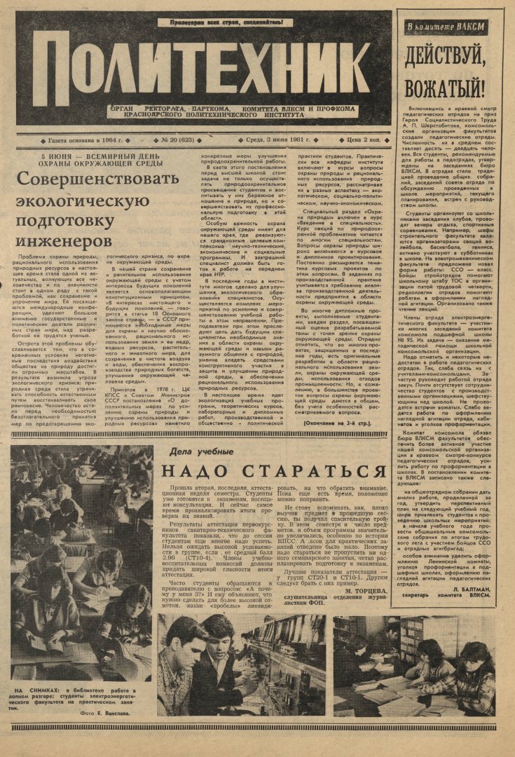 Политехник : газета/ Краснояр. политех. ин-т. - Красноярск : КГТУ, 1964 - - 2006 1981г. N 20 (623) (3 июня) http://lib3.sfu-kras.ru/ft/LIB2/ELIB_DC/SFUPRSV/sfupol/1981/1981_06_03_0623.pdf