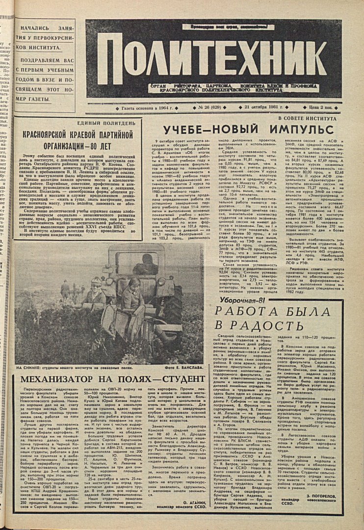 Политехник : газета. 1981 г. № 26 (629) (21 октября)