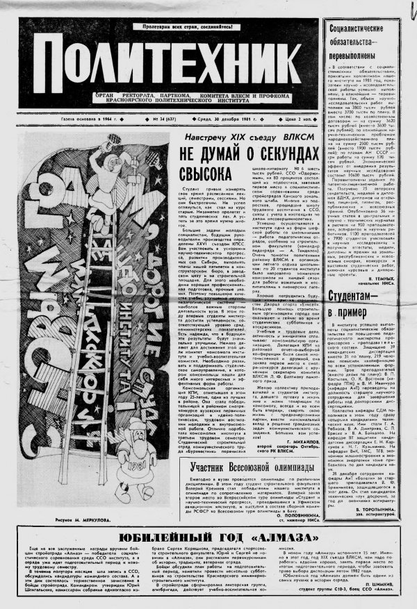 Политехник : газета/ Краснояр. политех. ин-т. - Красноярск : КГТУ, 1964 - - 2006 1981г. N 34 (637) (30 декабря) http://lib3.sfu-kras.ru/ft/LIB2/ELIB_DC/SFUPRSV/sfupol/1981/1981_12_30_0637.pdf