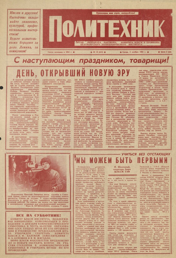 Политехник : газета/ Краснояр. политех. ин-т. - Красноярск : КГТУ, 1964 - - 2006 1982г. N 18 (655) (3 ноября) http://lib3.sfu-kras.ru/ft/LIB2/ELIB_DC/SFUPRSV/sfupol/1982/1982_11_03_0655.pdf