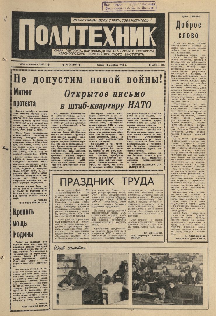 Политехник : газета. 1983 г. № 29 (690) (14 декабря)