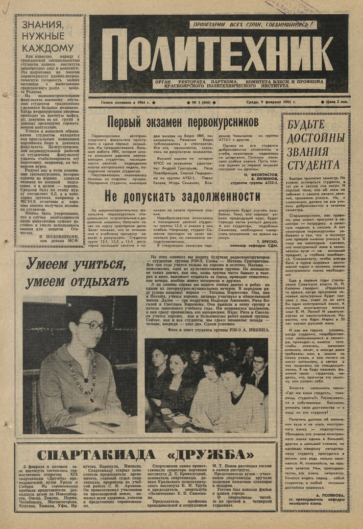 Политехник : газета. 1983 г. № 5 (666) (9 февраля)