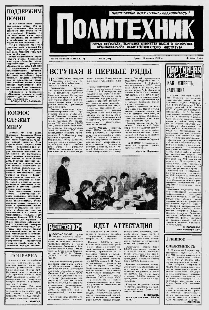 Политехник : газета/ Краснояр. политех. ин-т. - Красноярск : КГТУ, 1964 - - 2006 1984г. N 12 (704) (11 апреля) http://lib3.sfu-kras.ru/ft/LIB2/ELIB_DC/SFUPRSV/sfupol/1984/1984_04_11_0704.pdf