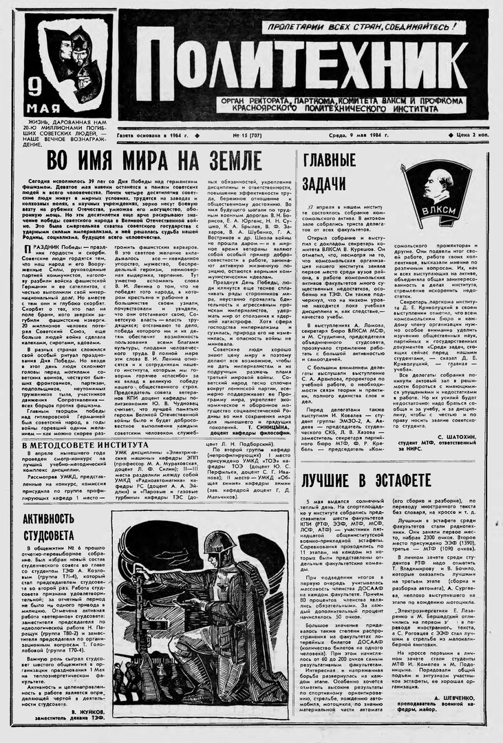 Политехник : газета/ Краснояр. политех. ин-т. - Красноярск : КГТУ, 1964 - - 2006 1984г. N 15 (707) (9 мая) http://lib3.sfu-kras.ru/ft/LIB2/ELIB_DC/SFUPRSV/sfupol/1984/1984_05_09_0707.pdf