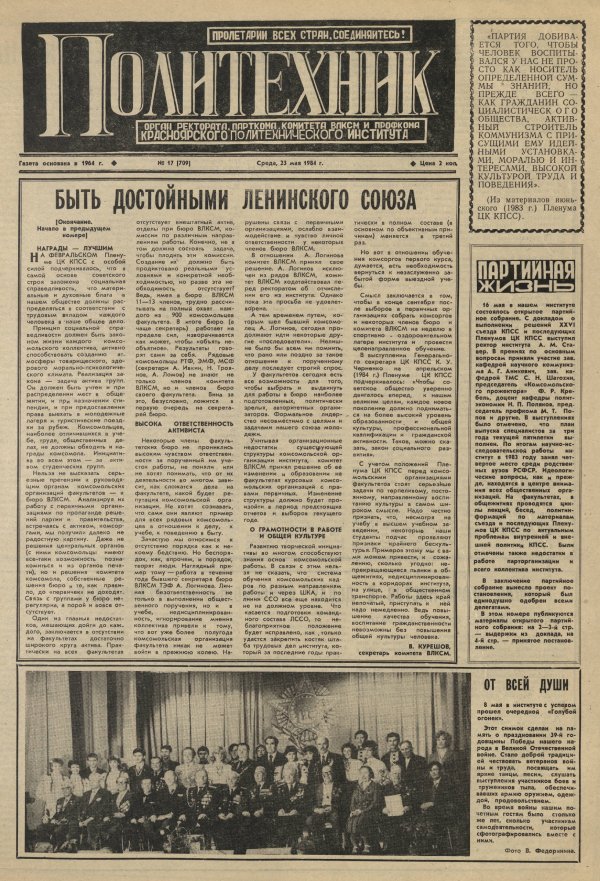 Политехник : газета/ Краснояр. политех. ин-т. - Красноярск : КГТУ, 1964 - - 2006 1984г. N 17 (709) (23 мая) http://lib3.sfu-kras.ru/ft/LIB2/ELIB_DC/SFUPRSV/sfupol/1984/1984_05_23_0709.pdf