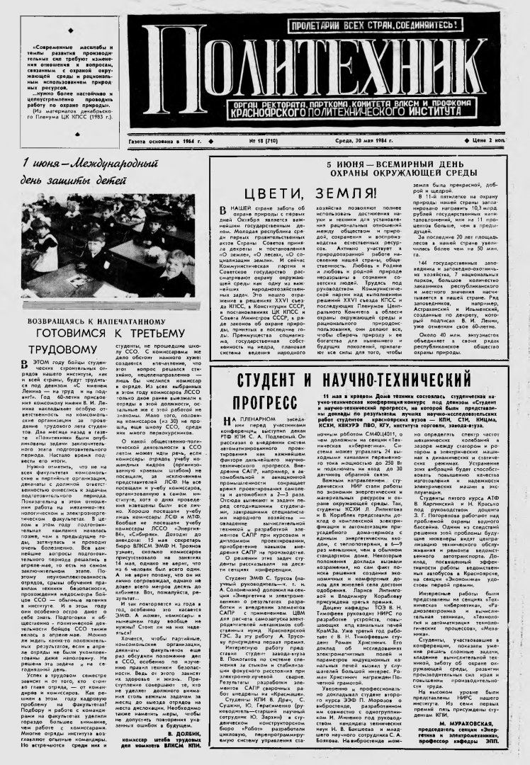 Политехник : газета/ Краснояр. политех. ин-т. - Красноярск : КГТУ, 1964 - - 2006 1984г. N 18 (710) (30 мая) http://lib3.sfu-kras.ru/ft/LIB2/ELIB_DC/SFUPRSV/sfupol/1984/1984_05_30_0710.pdf