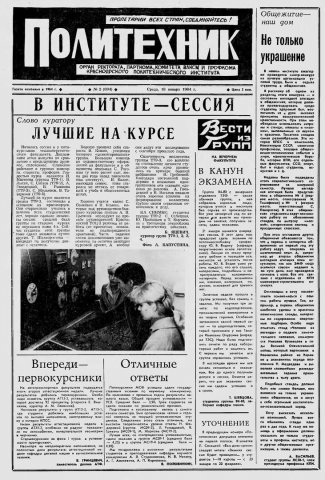 Политехник : газета/ Краснояр. политех. ин-т. - Красноярск : КГТУ, 1964 - - 2006 1984г. N 2 (694) (18 января) http://lib3.sfu-kras.ru/ft/LIB2/ELIB_DC/SFUPRSV/sfupol/1984/1984_01_18_0694.pdf