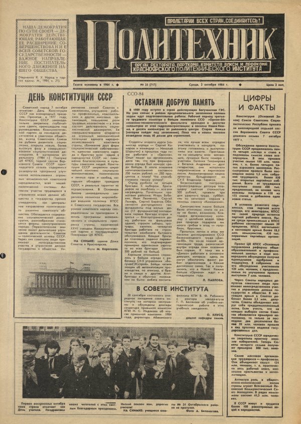 Политехник : газета/ Краснояр. политех. ин-т. - Красноярск : КГТУ, 1964 - - 2006 1984г. N 25 (717) (3 октября) http://lib3.sfu-kras.ru/ft/LIB2/ELIB_DC/SFUPRSV/sfupol/1984/1984_10_03_0717.pdf