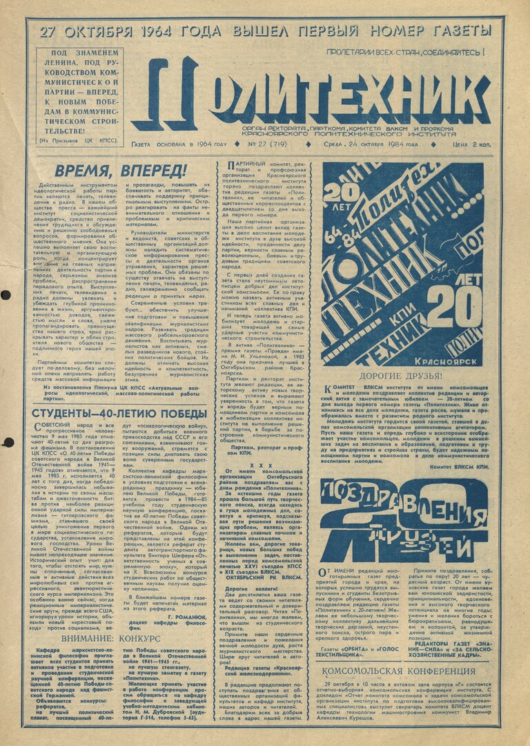 Политехник : газета/ Краснояр. политех. ин-т. - Красноярск : КГТУ, 1964 - - 2006 1984г. N 27 (719) (24 октября) http://lib3.sfu-kras.ru/ft/LIB2/ELIB_DC/SFUPRSV/sfupol/1984/1984_10_24_0719.pdf