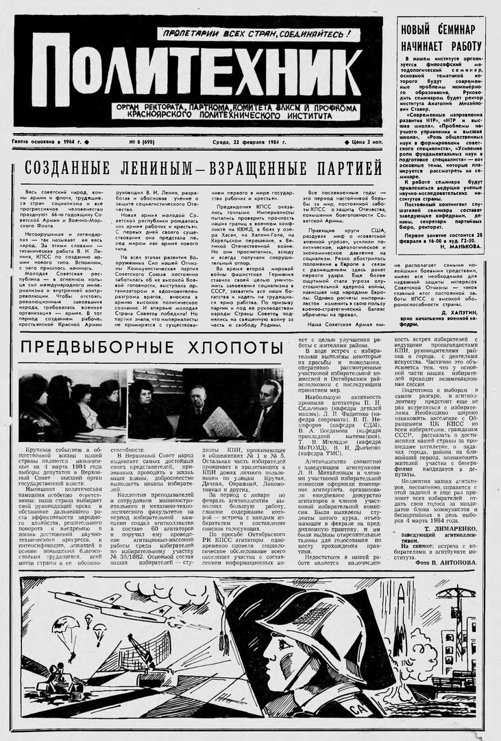 Политехник : газета/ Краснояр. политех. ин-т. - Красноярск : КГТУ, 1964 - - 2006 1984г. N 6 (698) (22 февраля) http://lib3.sfu-kras.ru/ft/LIB2/ELIB_DC/SFUPRSV/sfupol/1984/1984_02_22_0698.pdf