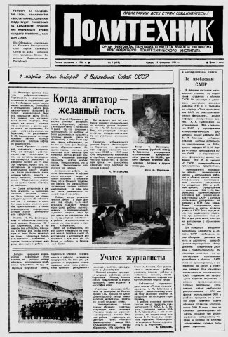 Политехник : газета/ Краснояр. политех. ин-т. - Красноярск : КГТУ, 1964 - - 2006 1984г. N 7 (699) (29 февраля) http://lib3.sfu-kras.ru/ft/LIB2/ELIB_DC/SFUPRSV/sfupol/1984/1984_02_29_0699.pdf