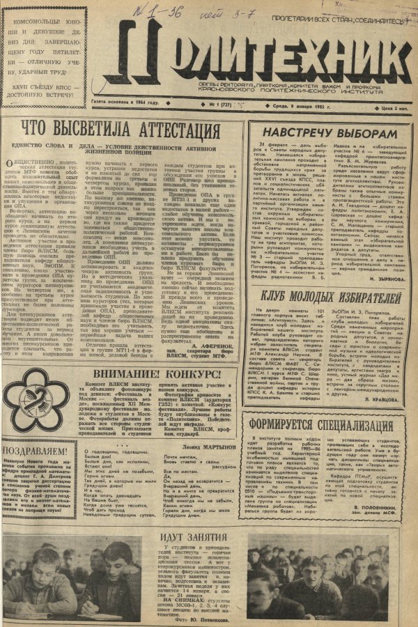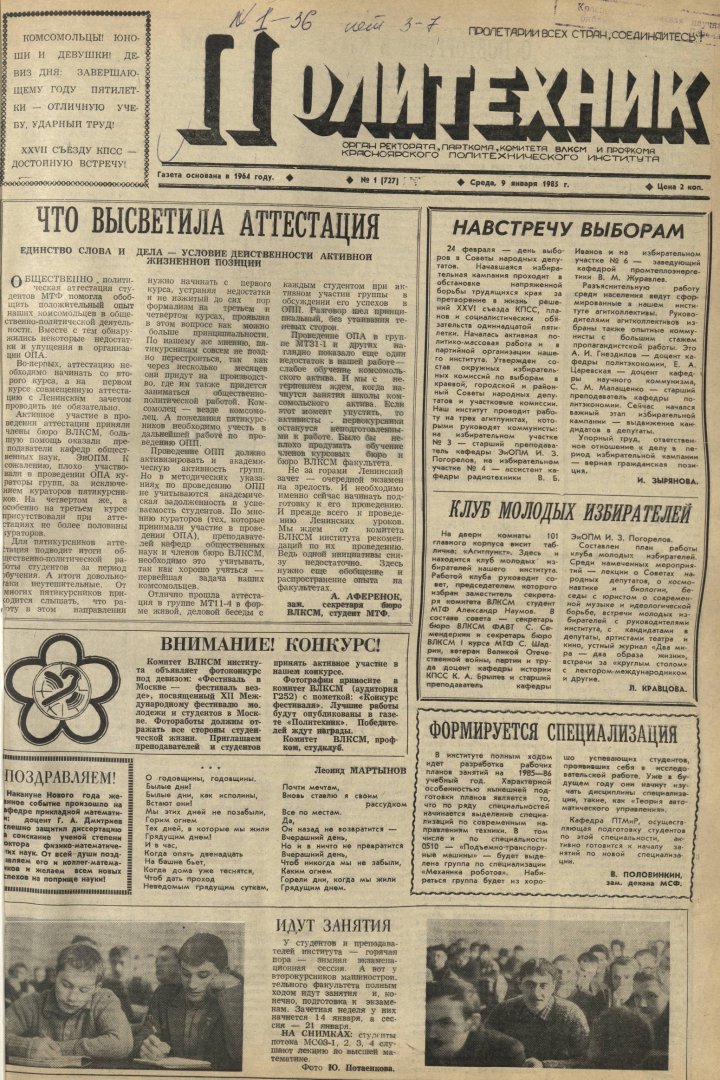 Политехник : газета. 1985 г. № 1 (727) (9 января)