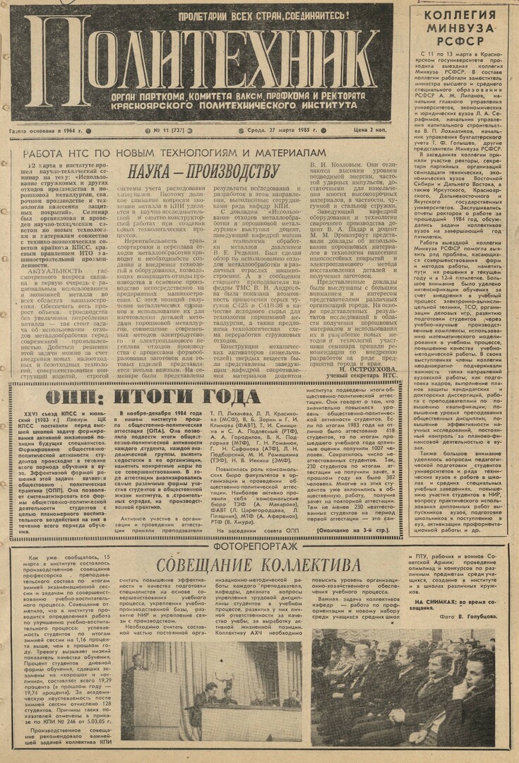 Политехник : газета. 1985 г. № 11 (737) (27 марта)