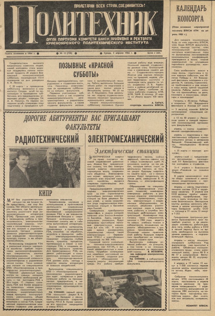 Политехник : газета. 1985 г. № 12 (738) (3 апреля)