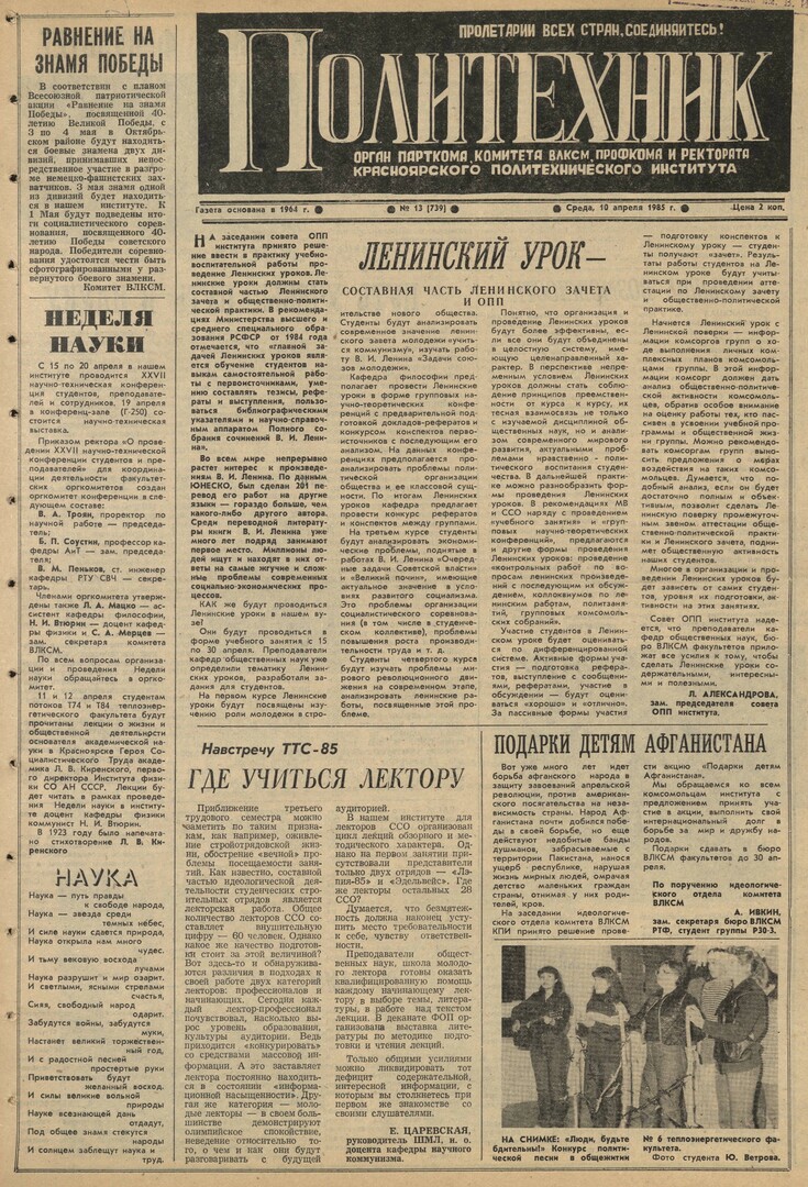 Политехник : газета. 1985 г. № 13 (739) (10 апреля)