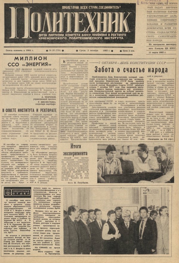 Политехник : газета. 1985 г. № 25 (751) (2 октября)
