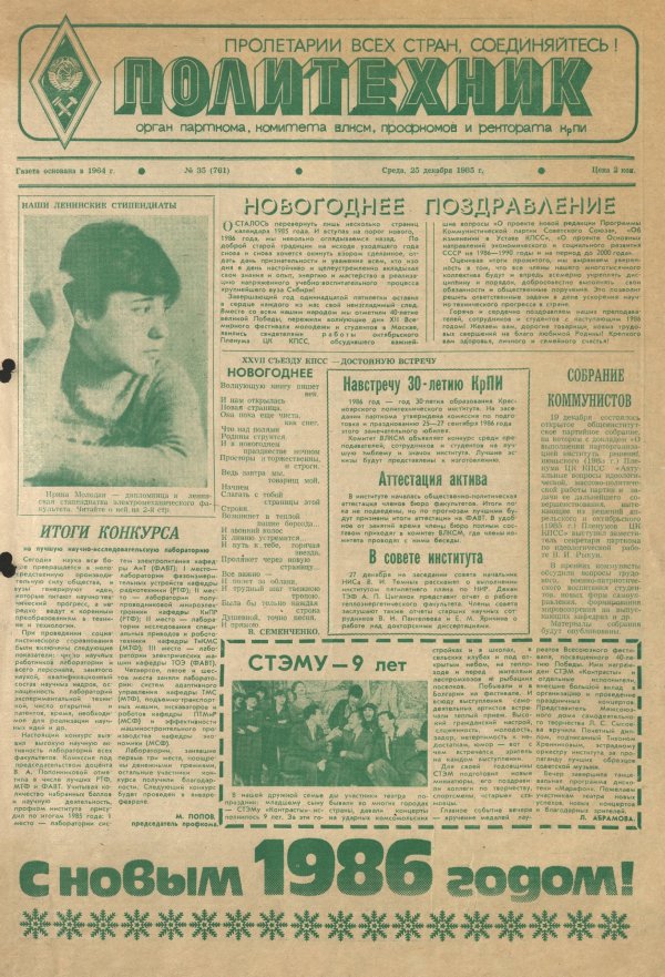 Политехник : газета/ Краснояр. политех. ин-т. - Красноярск : КГТУ, 1964 - - 2006 1985г. N 35 (761) (25 декабря) http://lib3.sfu-kras.ru/ft/LIB2/ELIB_DC/SFUPRSV/sfupol/1985/1985_12_25_0761.pdf