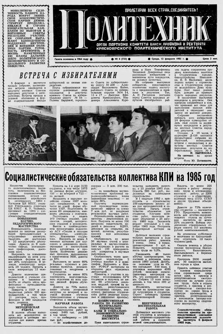 Политехник : газета/ Краснояр. политех. ин-т. - Красноярск : КГТУ, 1964 - - 2006 1985г. N 6 (732) (13 февраля) http://lib3.sfu-kras.ru/ft/LIB2/ELIB_DC/SFUPRSV/sfupol/1985/1985_02_13_0732.pdf