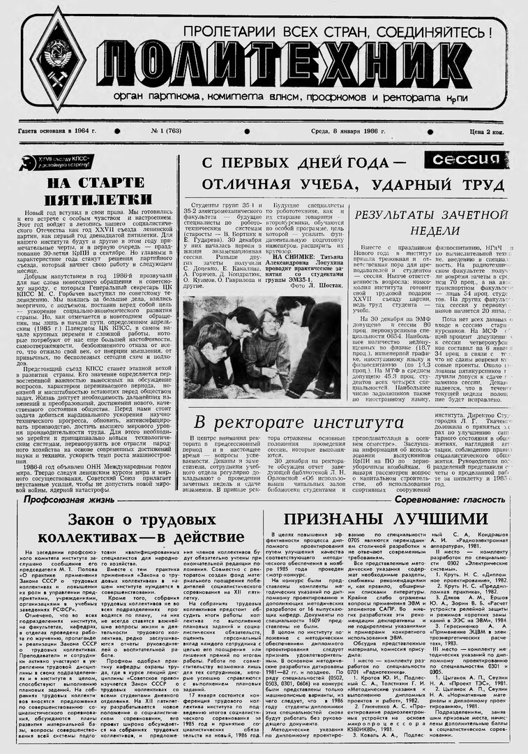 Политехник : газета. 1986 г. № 1 (763) (8 января)