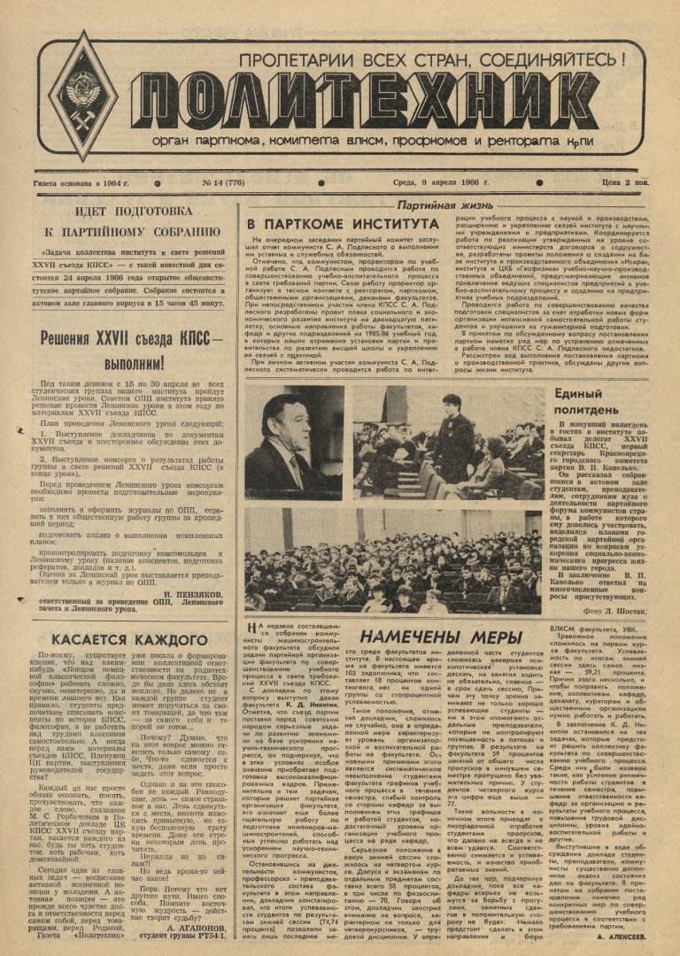 Политехник : газета. 1986 г. № 14 (776) (9 апреля)