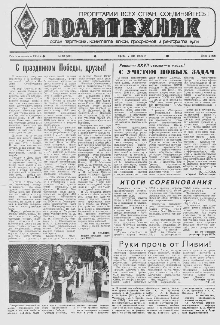Политехник : газета. 1986 г. № 18 (780) (7 мая)