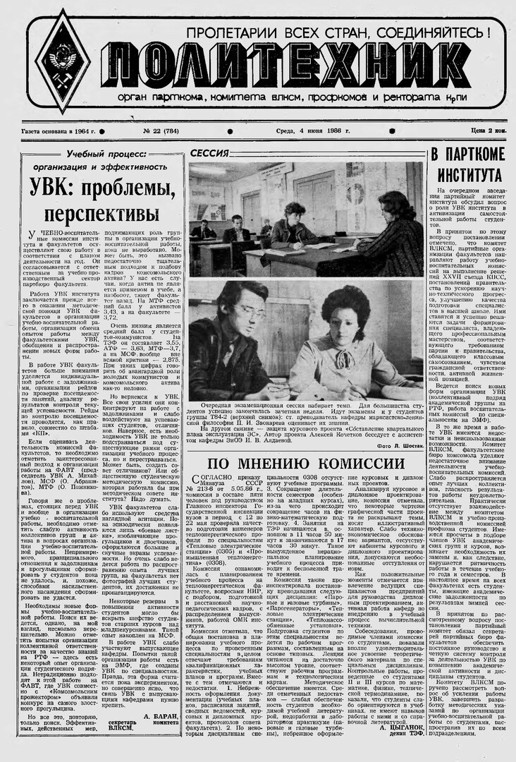 Политехник : газета. 1986 г. № 22 (784) (4 июня)