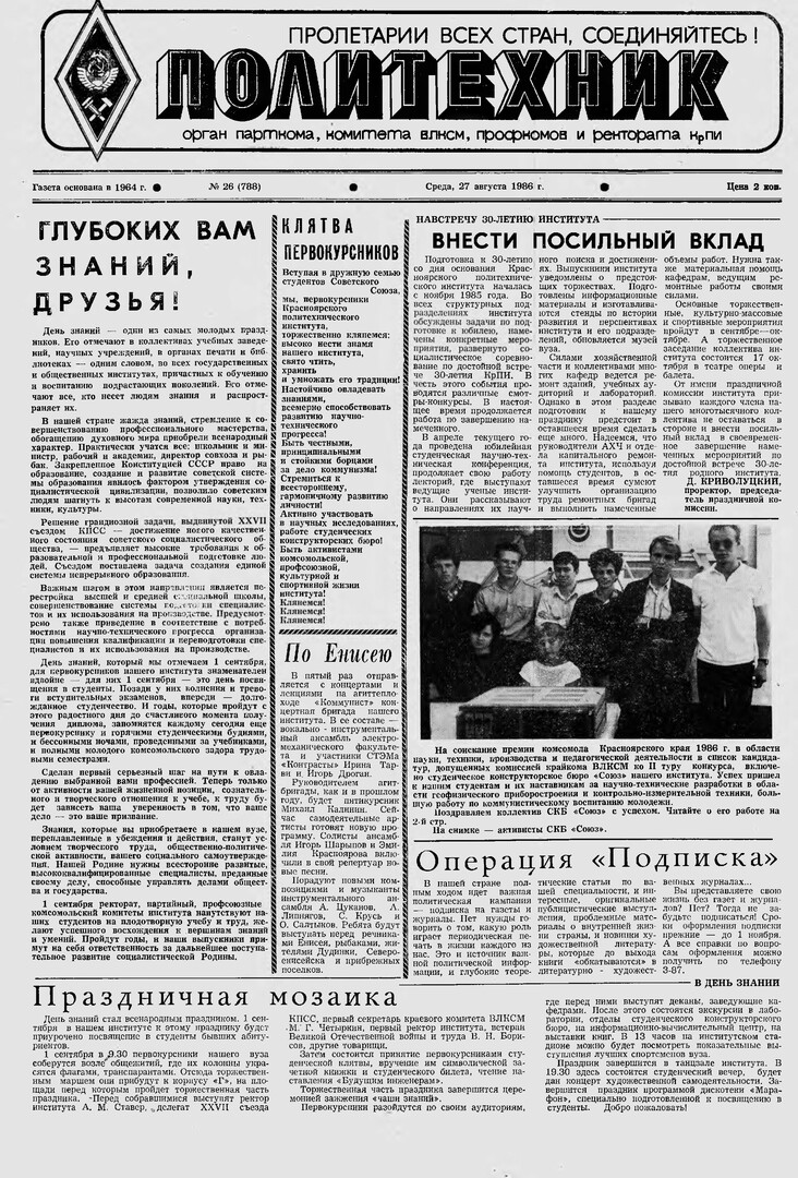 Политехник : газета/ Краснояр. политех. ин-т. - Красноярск : КГТУ, 1964 - - 2006 1986г. N 26 (788) (27 августа) http://lib3.sfu-kras.ru/ft/LIB2/ELIB_DC/SFUPRSV/sfupol/1986/1986_08_27_0788.pdf