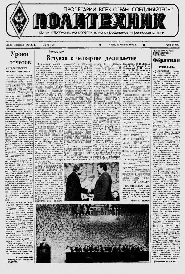 Политехник : газета/ Краснояр. политех. ин-т. - Красноярск : КГТУ, 1964 - - 2006 1986г. N 31 (792) (29 октября) http://lib3.sfu-kras.ru/ft/LIB2/ELIB_DC/SFUPRSV/sfupol/1986/1986_10_29_0792.pdf