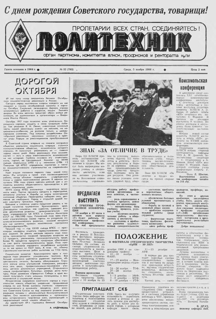 Политехник : газета/ Краснояр. политех. ин-т. - Красноярск : КГТУ, 1964 - - 2006 1986г. N 32 (793) (5 ноября) http://lib3.sfu-kras.ru/ft/LIB2/ELIB_DC/SFUPRSV/sfupol/1986/1986_11_05_0793.pdf